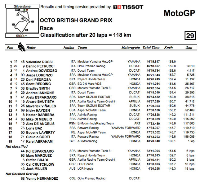 To sum it up, all in all it was a brilliant wet race and The Doctor again thrived in this and now, he has created a substantial gap between him and Jorge Lorenzo in the world standing.