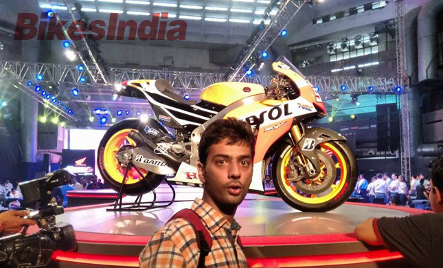 A Championship winning 2013 Honda RC213V at the end of the Ramp, unveiled by Muramatsu san (President & CEO, HMSI). The moment I saw the bike, my jaws were literally on the floor! Such was the happiness I felt. I've been a big fan of Honda and have great respect for Shacho san (Soichiro Honda- Founder of the Honda group) and getting the opportunity to see and touch a MotoGP bike is something I've never dreamt of!